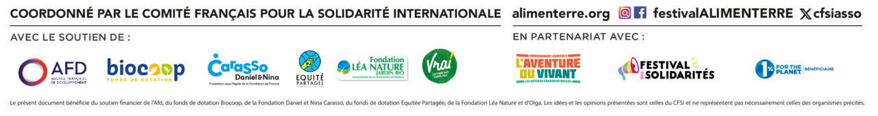 En donnant la parole à celles et ceux qui, en France et à travers le monde, s'engagent pour une alimentation durable et solidaire, le festival ALIMENTERRE appelle à une prise de conscience et d'initiatives collectives pour un avenir durable. Chaque année, le festival informe, sensibilise et incite près de 100.000 personnes à contribuer à un système alimentaire plus durable et solidaire.