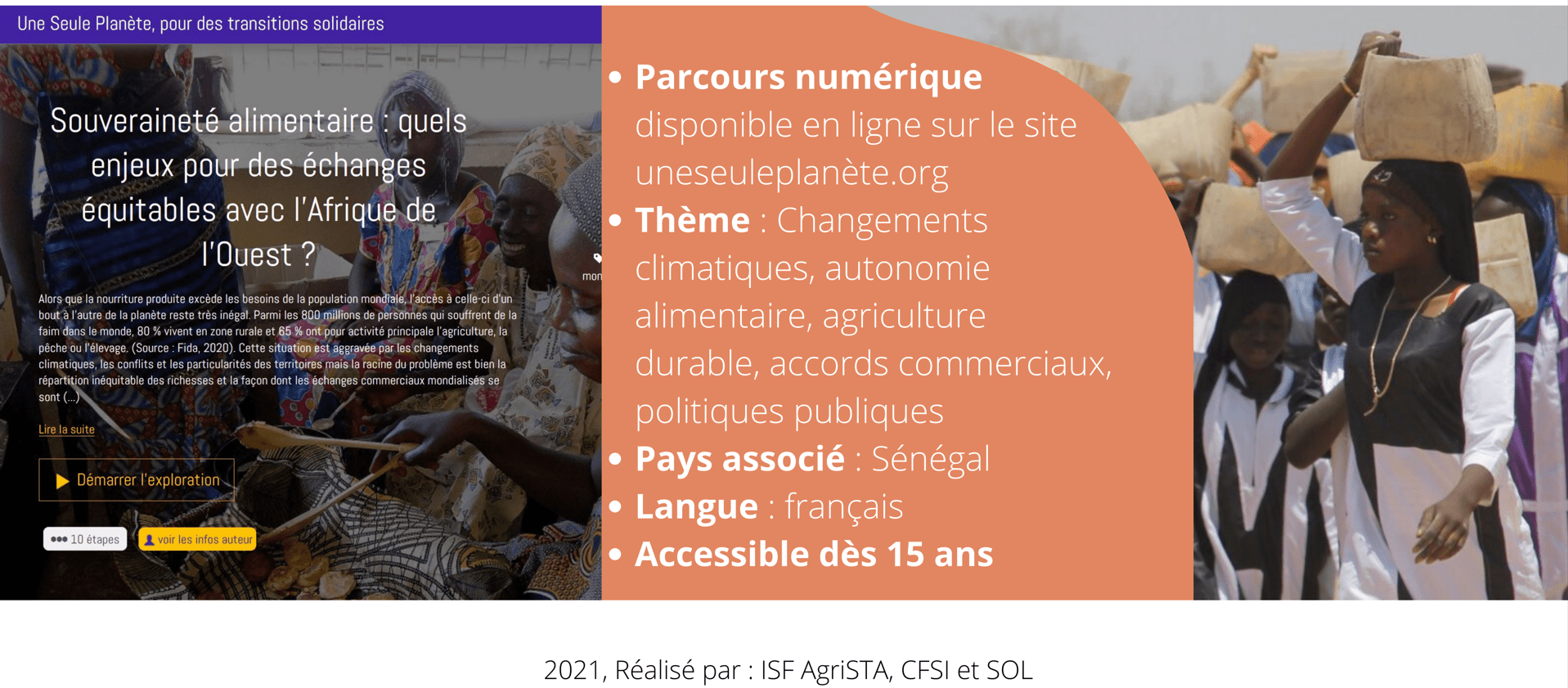SOL a développé le parcours numérique “Souveraineté alimentaire : quels enjeux pour des échanges équitables avec l’Afrique de l’Ouest ?” en partenariat avec le CFSI et Ingénieurs sans Frontières. Il s’agit d’un support pédagogique innovant et multimédia, présenté en 9 étapes thématiques reliées les unes aux autres et complétées par des ressources documentaires, des outils pédagogiques et des alternatives pour appréhender ces enjeux et s’inspirer d’alternatives concrètes.