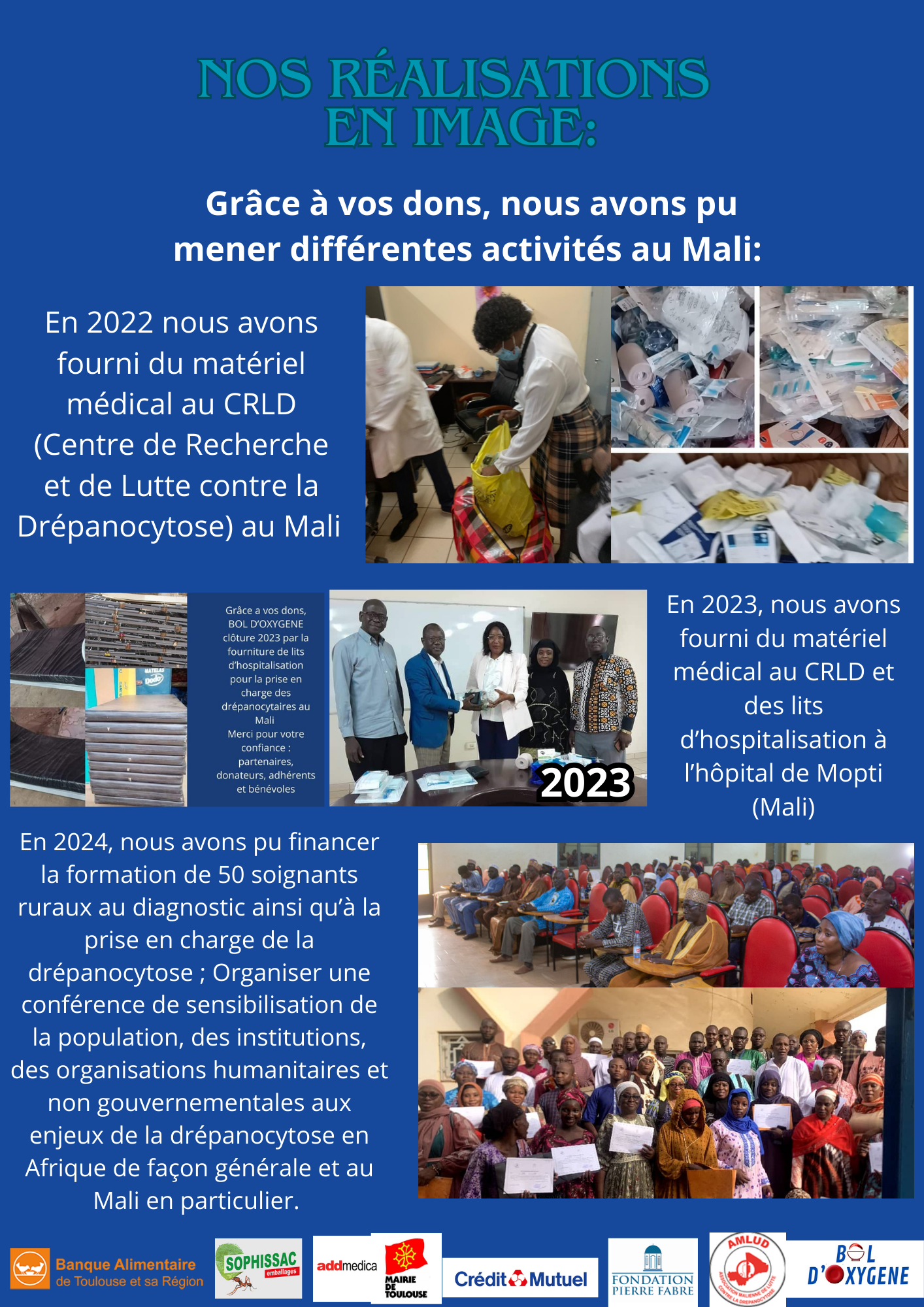 Bol d'Oxygène est une association à but non lucratif et apolitique, dont l'objectif est de participer à l'amélioration de la qualité de vie et à la scolarisation des patients drépanocytaires maliens en particulier celle des enfants. L'association mène des actions telles que : la collecte de matériel médical et de fourniture scolaire, la recherche de financement pour le dépistage et la sensibilisation des soignants et de la population et l'implication par tout autre moyen permettant une meilleure inclusion des enfants drépanocytaires à la vie scolaire.