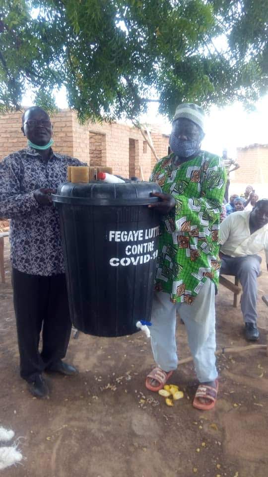 En attendant la poursuite de nos activités, nous avons offert des laves mains, javels et savons pour contribuer à la lutte contre le Covid19 au chef du village pour les parents et élèves confinés à Guindi au TCHAD.
