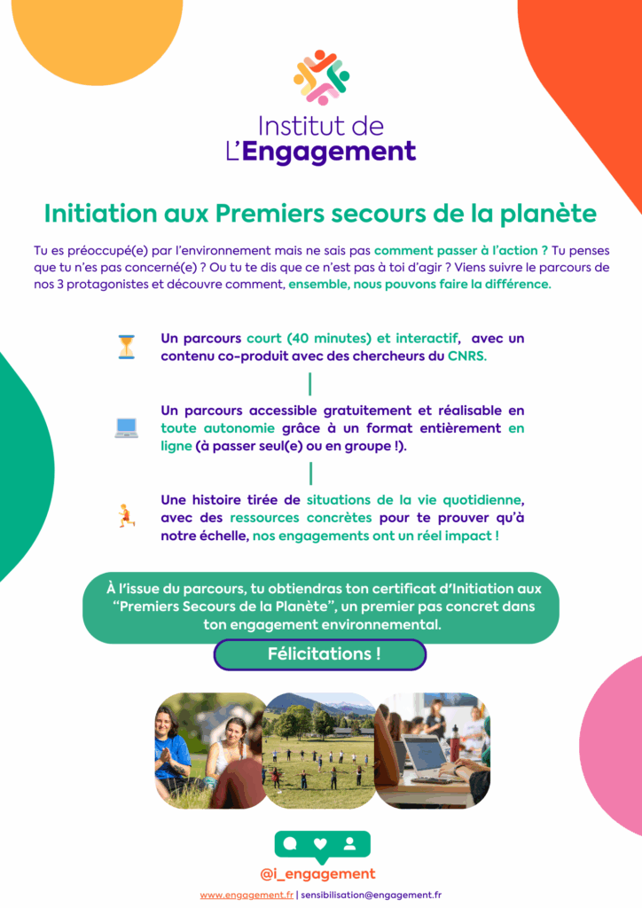 Depuis 2022, l'Institut de l'Engagement a créé un programme de sensibilisation pour informer et mobiliser autour des enjeux d'intérêt général. L'institut propose deux parcours de formation en ligne gratuits, co-construits avec le CNRS, les “Premiers Secours de la Planète” en lien avec l’ODD 13 – Lutte contre les changements climatiques et leurs répercussions.