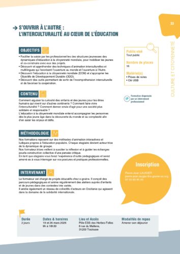 Cette formation vise à renforcer les postures, développer l’esprit critique et outiller les acteur·rices éducatif·ves pour faire de l’interculturalité un véritable levier d’émancipation et de cohésion.