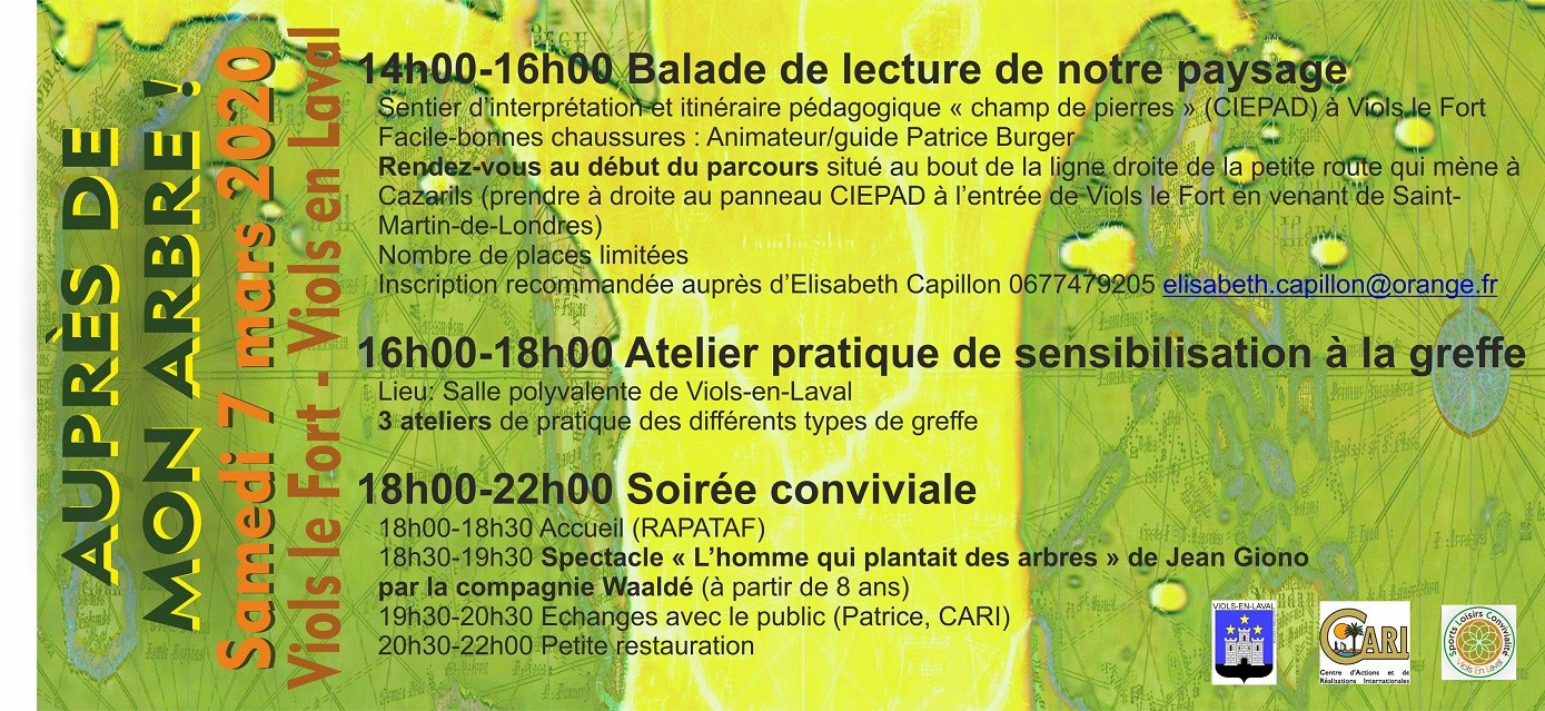 Le CARI organise avec les associations violiennes une journée de balade pédagogique, d’initiation à la greffe d'arbustes et de théâtre à Viols-le-Fort & Viols-en-Laval le samedi 7 mars.