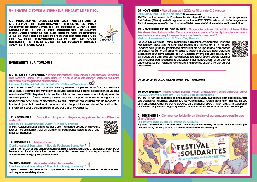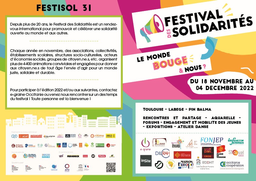 Cette année le Festival des solidarités se déroulera entre le 18 novembre et le 04 décembre et le Collectif Festisol 31 vous a concocté une jolie programmation ! N’hésitez pas à la diffuser dans votre entourage et à participer aux différents temps proposés !