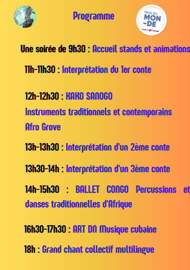 Aux programmes, des stands culturels (spécialités gastronomiques, tresses africaines, maquillage, jeux, vente de bijoux et produits venant d'Afrique). Le tout rythmé par des artistes qui vous emporteront au travers de musiques et lectures de contes multilingues...