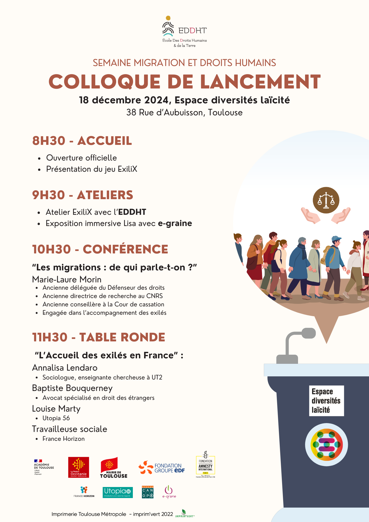 Ce colloque mêlant ateliers ludopédagogiques, conférence “migrations : de qui parle-t-on ?” et table ronde des acteurs de l’accueil en France se déroula à l’Espace diversités laïcités le 18 décembre 2024 de 8h30 à 12h30.