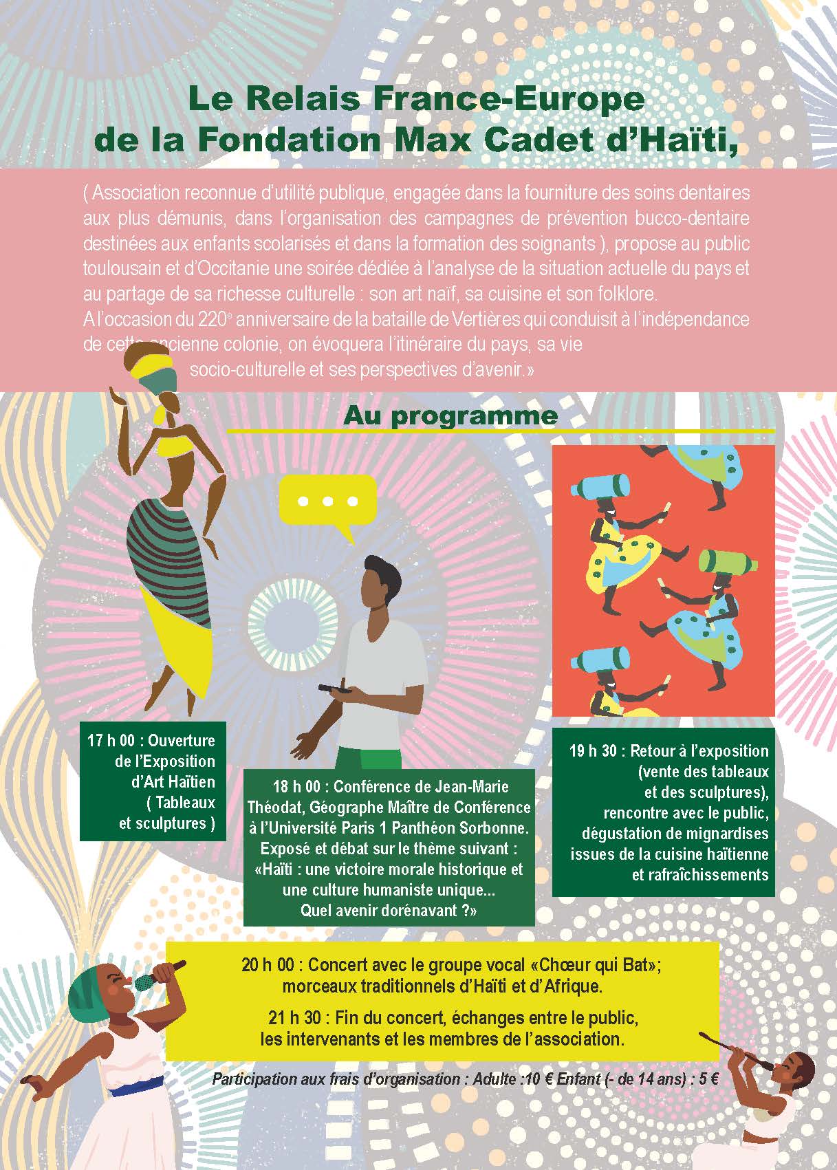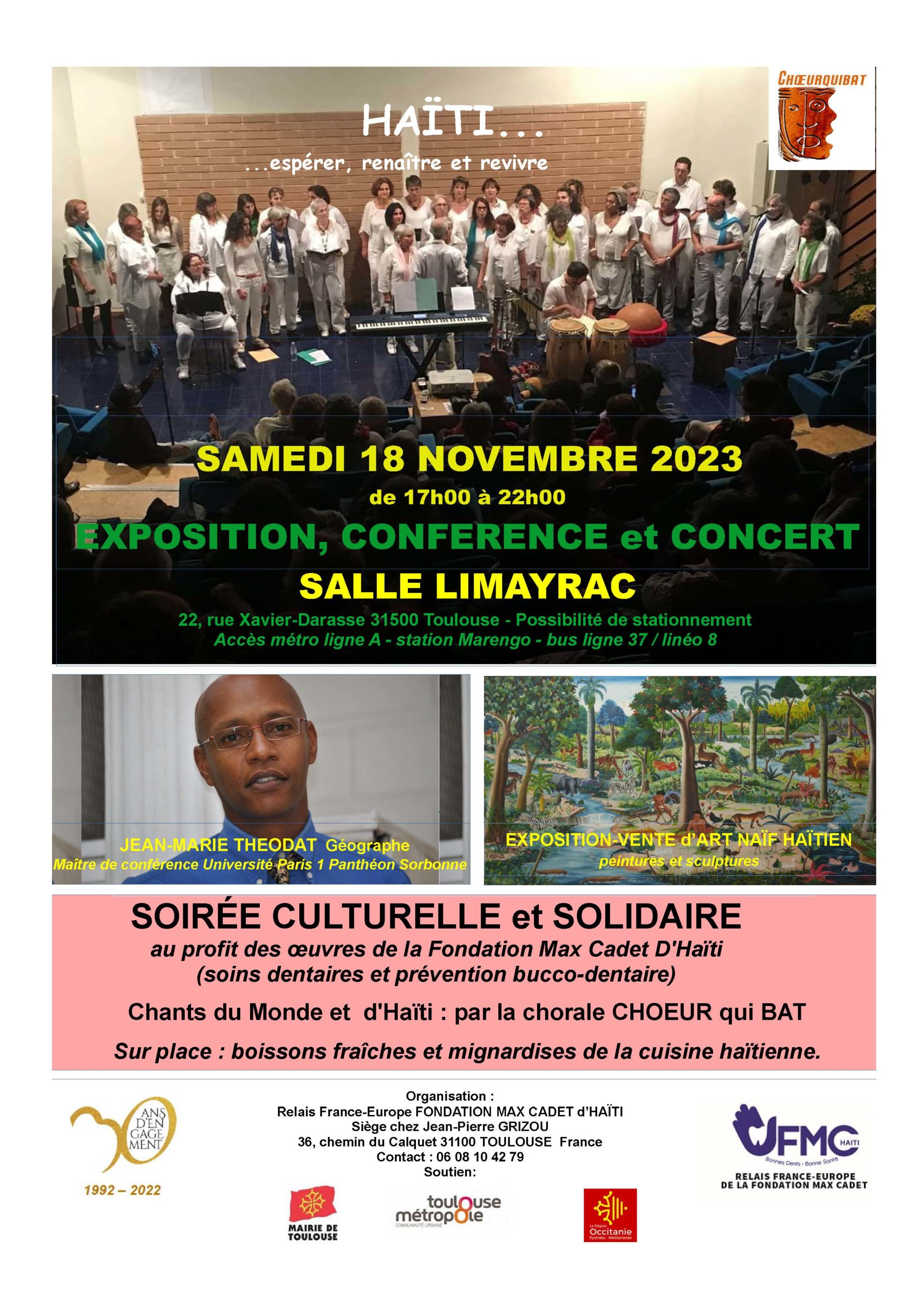 Le 18 novembre prochain à la Salle LIMAYRAC à Toulouse le Relais France-Europe de la FMC d’Haïti organise une Soirée Culturelle et Solidaire au profit des œuvres de la Fondation Max Cadet d’Haïti à travers sa Clinique Dentaire sise au Canapé-Vert Port-au-Prince Haïti. Y sont dispensés des soins dentaires aux démunis, de la prévention bucco-dentaire aux enfants scolarisés et de la formation permanente aux soignants.